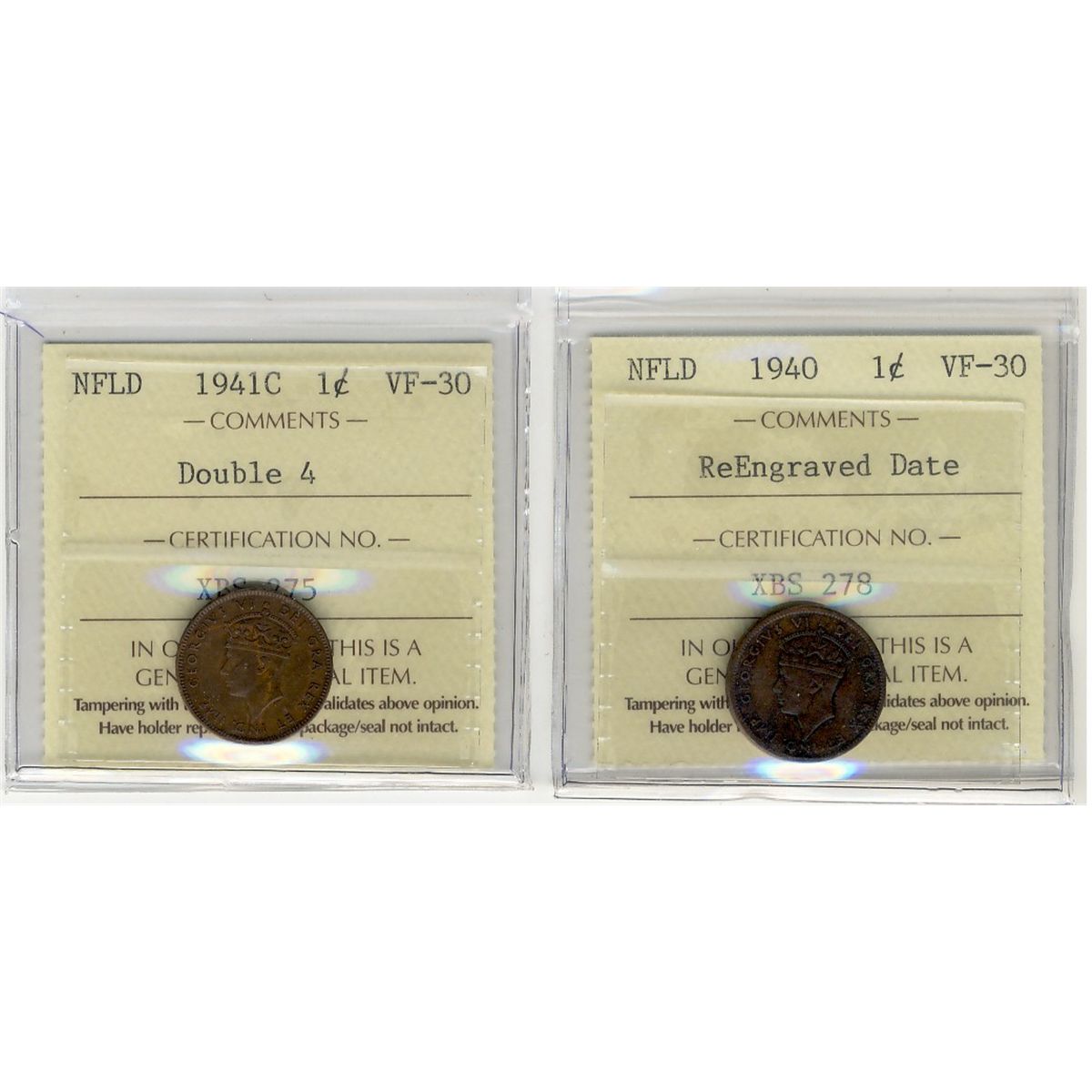 Nfld 1940 1¢ Re-eng & 1941c Dbl 4 ICCS VF30. Lot of 2 coins.