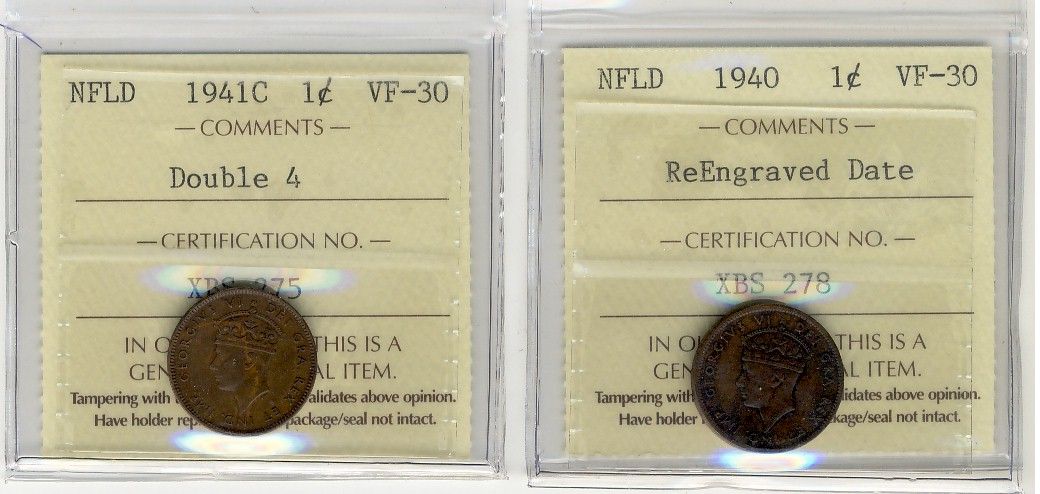 Nfld 1940 1¢ Re-eng & 1941c Dbl 4 ICCS VF30. Lot of 2 coins.