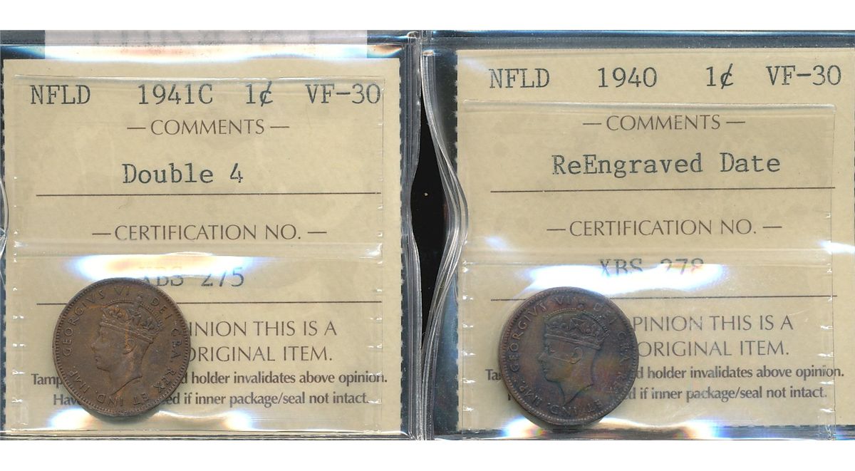 Nfld 1940 1¢ Re-eng & 1941c Dbl 4 ICCS VF30. Lot of 2 coins.