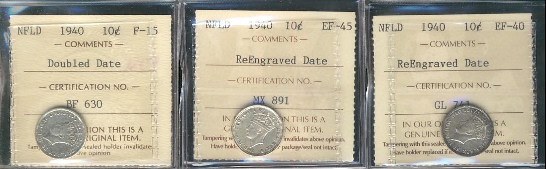 Nfld 1940 10¢ Re-eng EF40, EF45 & Dbl Date F15. Lot of 3 ICCS graded examples.