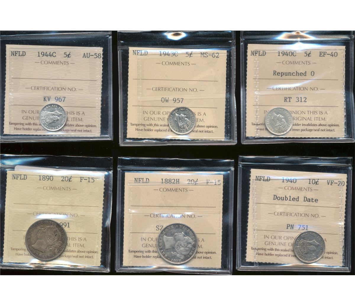 Nfld 1940 5¢ Repunched ‘0’ EF40, 1943 MS62, 1944 AU58, 1940 Doubled Date 10¢ VF20, 1882H 20¢ Fine 15 & 1890 20¢ Fine 15. Lot of 6 coins all ICCS graded.