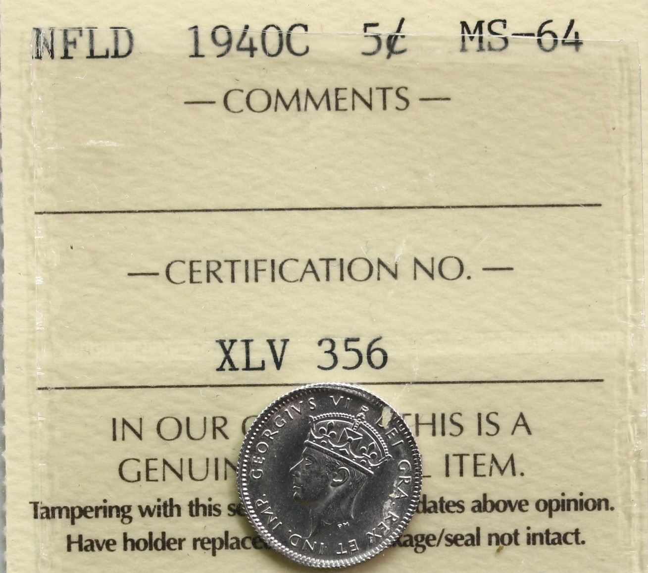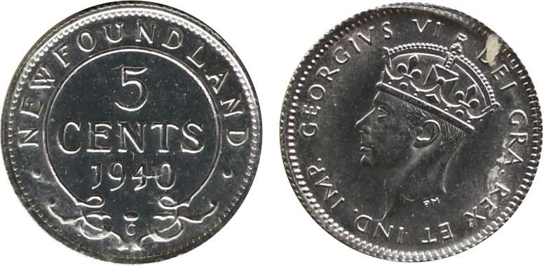 Nfld; 1940-C 5¢ ICCS Choice Mint State-64 Lustrous example