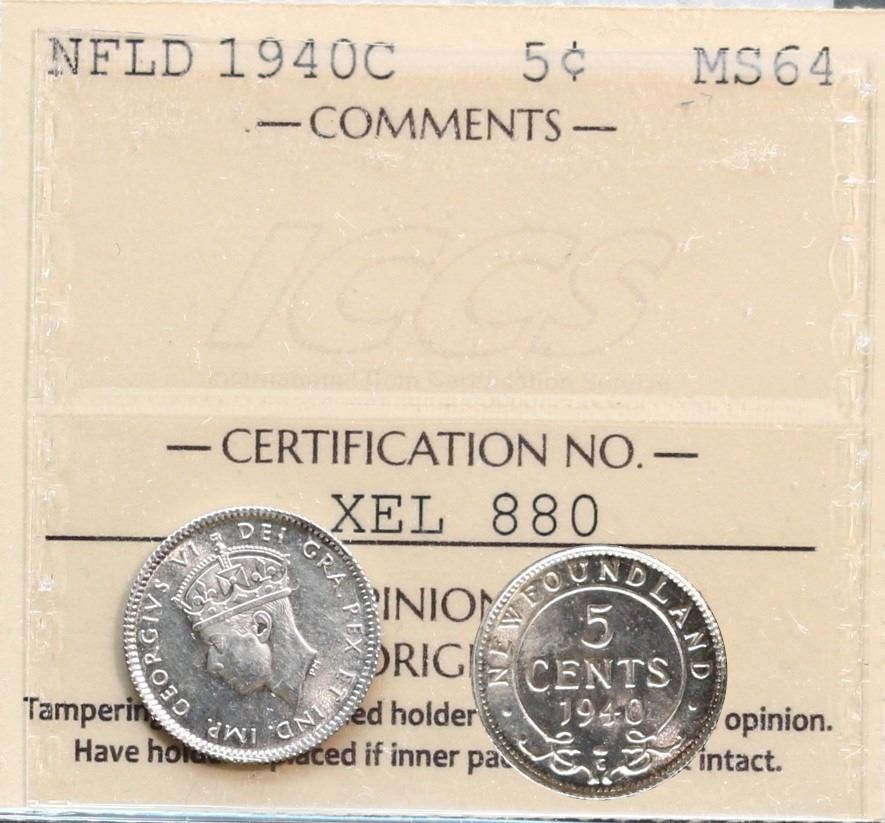 Nfld 1940-C 5¢ ICCS Choice Mint State-64