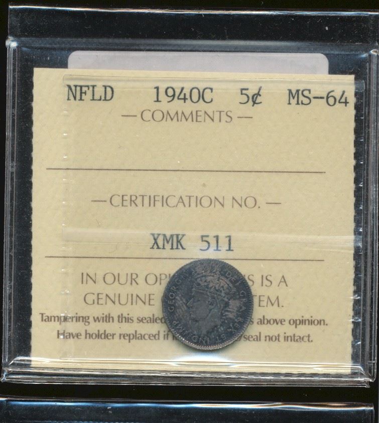 Nfld 1940c 5¢ ICCS MS64. Brilliant and lustrous.