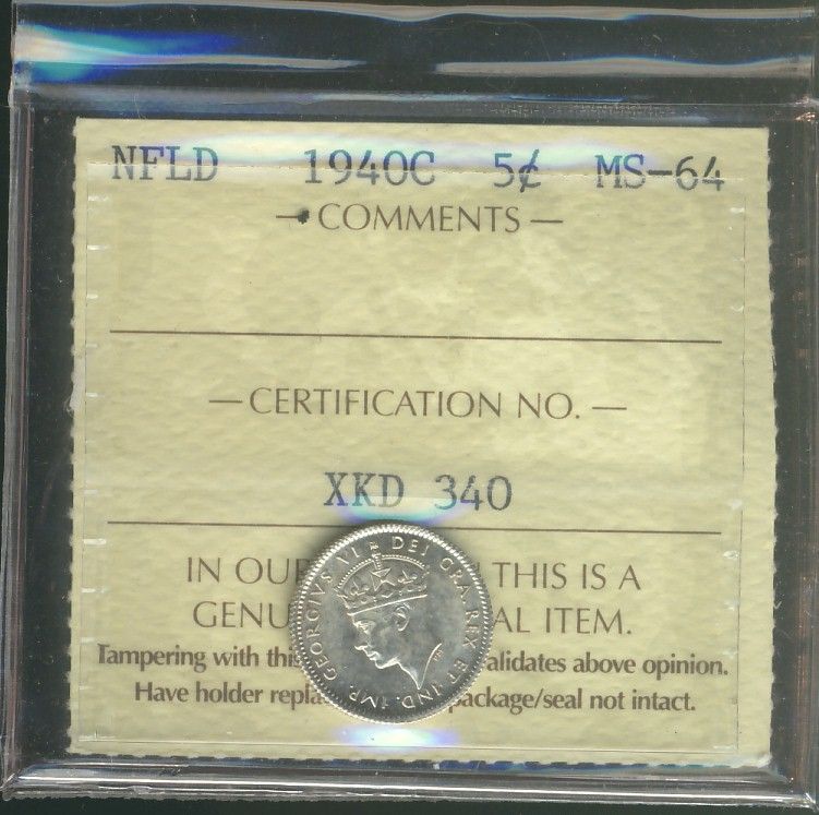 Nfld 1940c 5¢ ICCS MS64. Superb lustre and white issue.
