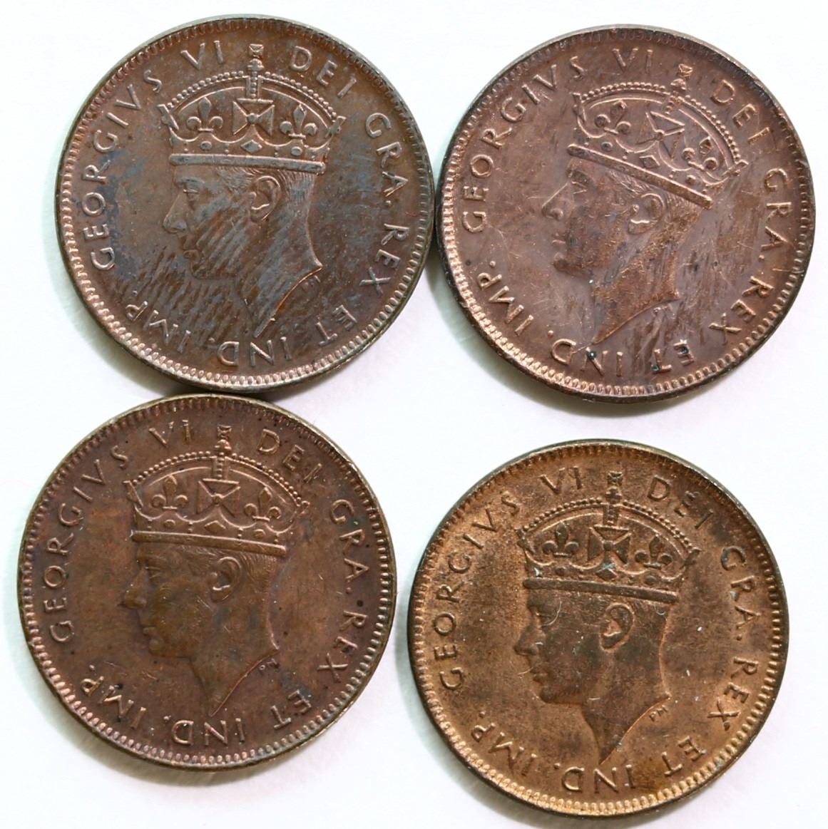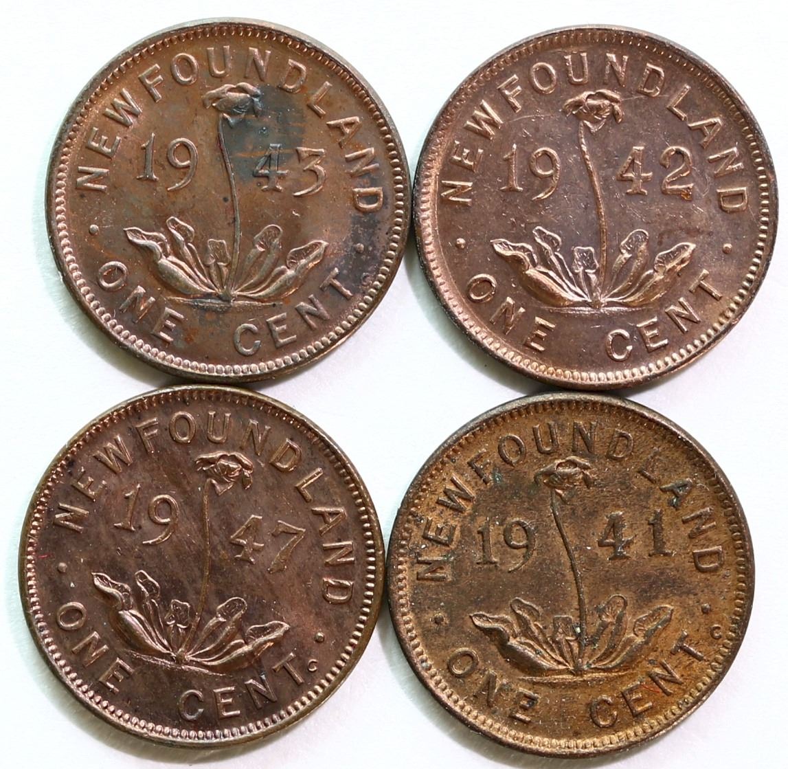 Nfld; 1941 1¢, 1942, 1943, 1947, Lot of 4 coins Unc or better with traces of Red.