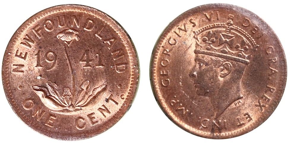 Nfld; 1941-C 1¢ ICCS Gem Mint State-65 Red. 90% red surrounded by strong lustrous fields. Very scarce in Gem condition. The best example seen and handled by us.