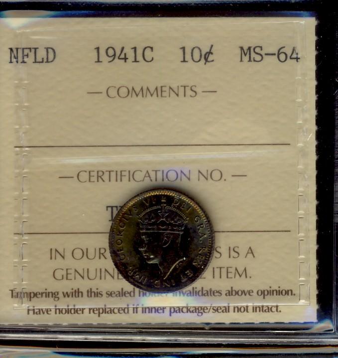 Nfld 1941c 10¢ ICCS MS64. Lustrous with intense gold to brown shades.