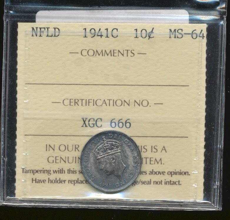Nfld 1941c 10¢ ICCS MS64. Strong frost and reddish-blue toning.