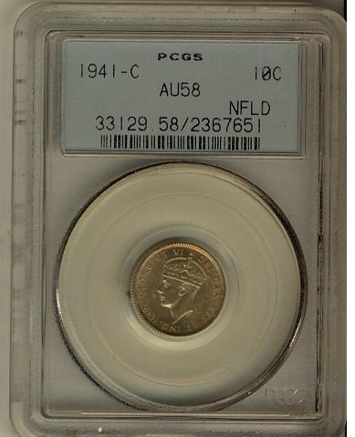 Nfld 1941c 10¢ PCGS AU58, light golden tone.