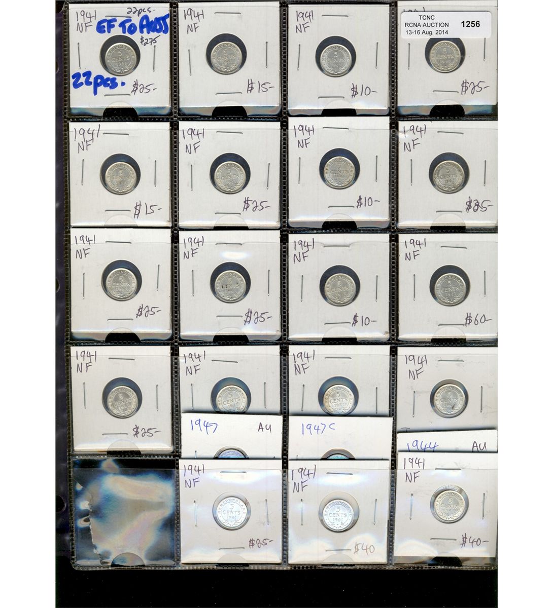 Nfld 1941c(19) 5¢, 1944c & 1947c(2). Nice lot of 22 pcs EF to AU55, most with lustre.