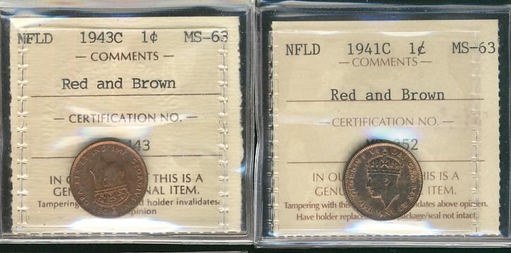 Nfld 1941c & 1943c 1¢ ICCS MS63RB. Lot of 2 coins.