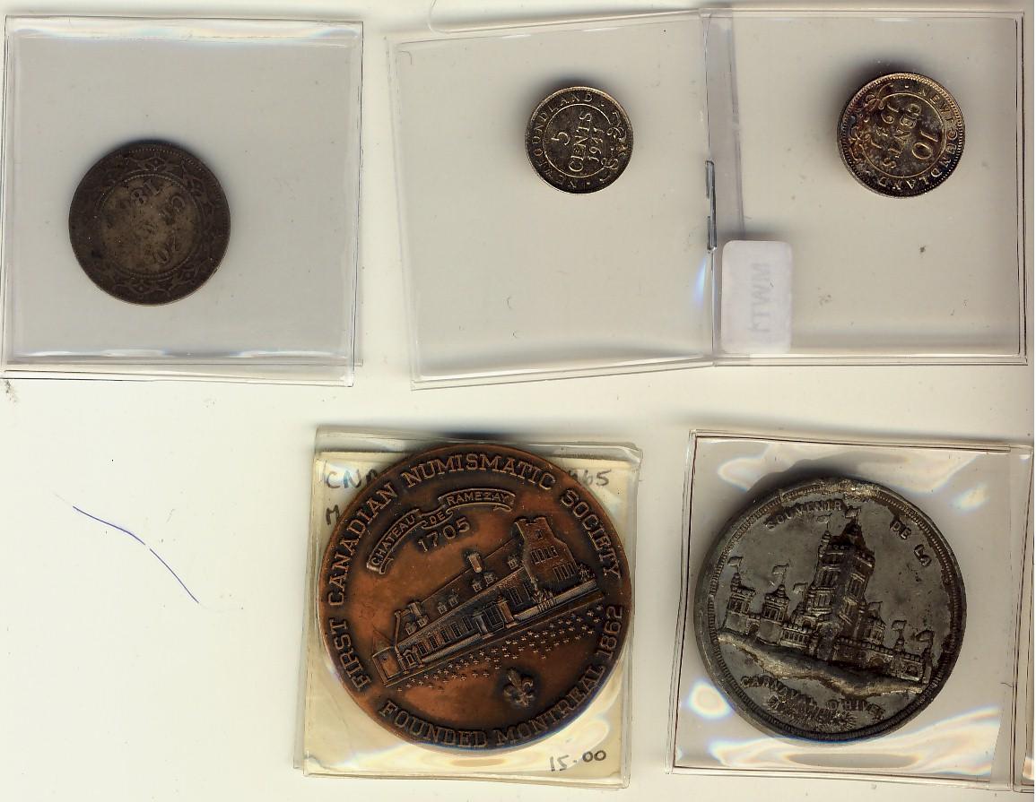 Nfld 1941c 5¢ & 10¢. Lot of 2 coins AU to UNC. Along with 1880 20¢ G/VG and 2 separate medals one from Quebec Carnival & 1965 CNA 12th Annual Convention.