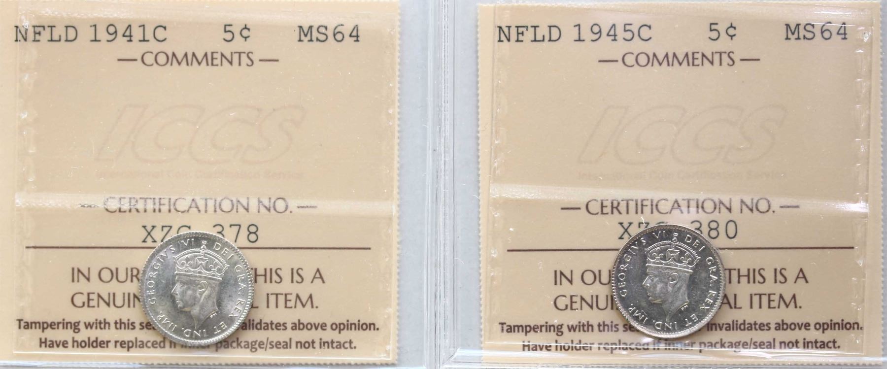 Nfld; 1941c 5¢, 1945c, Both coins ICCS Very Choice Mint State-64 and lustrous.