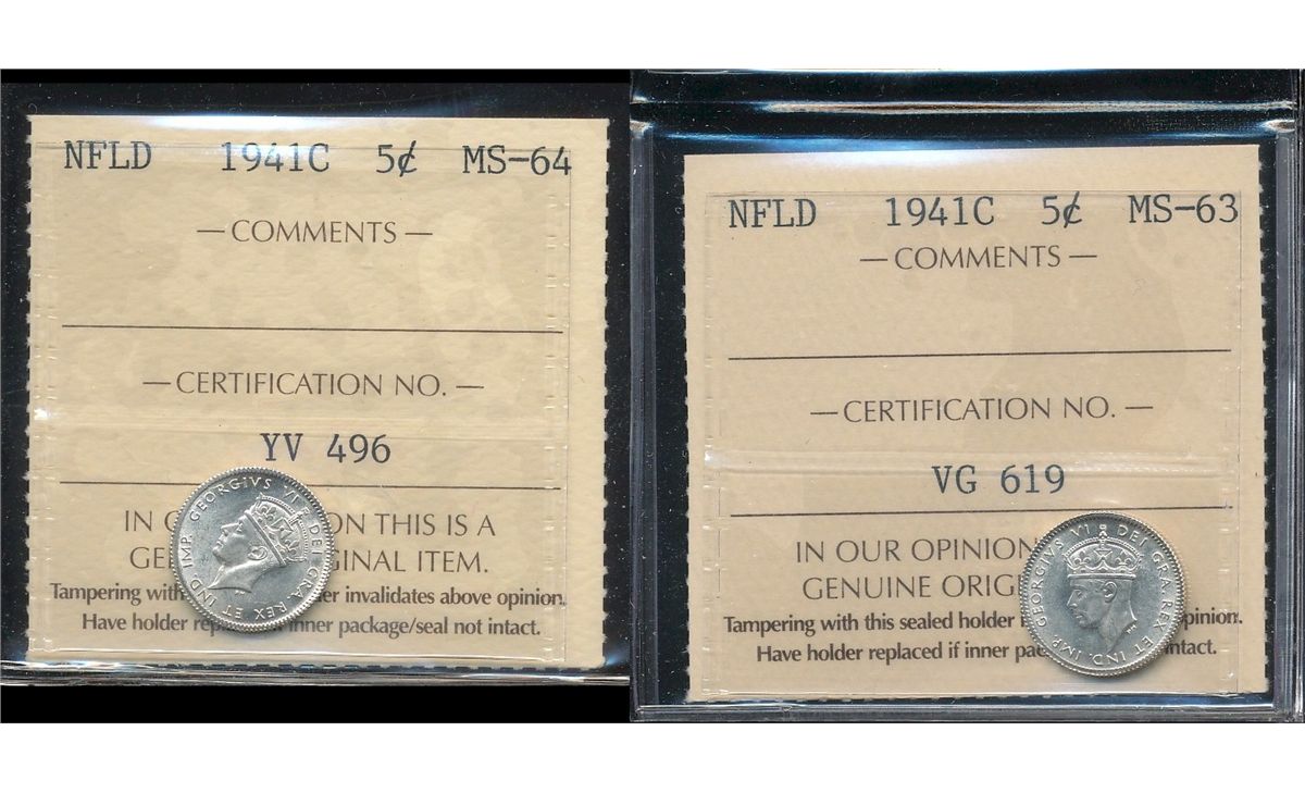 Nfld 1941c 5¢ ICCS MS63 & MS64. Lot of 2 ICCS coins.