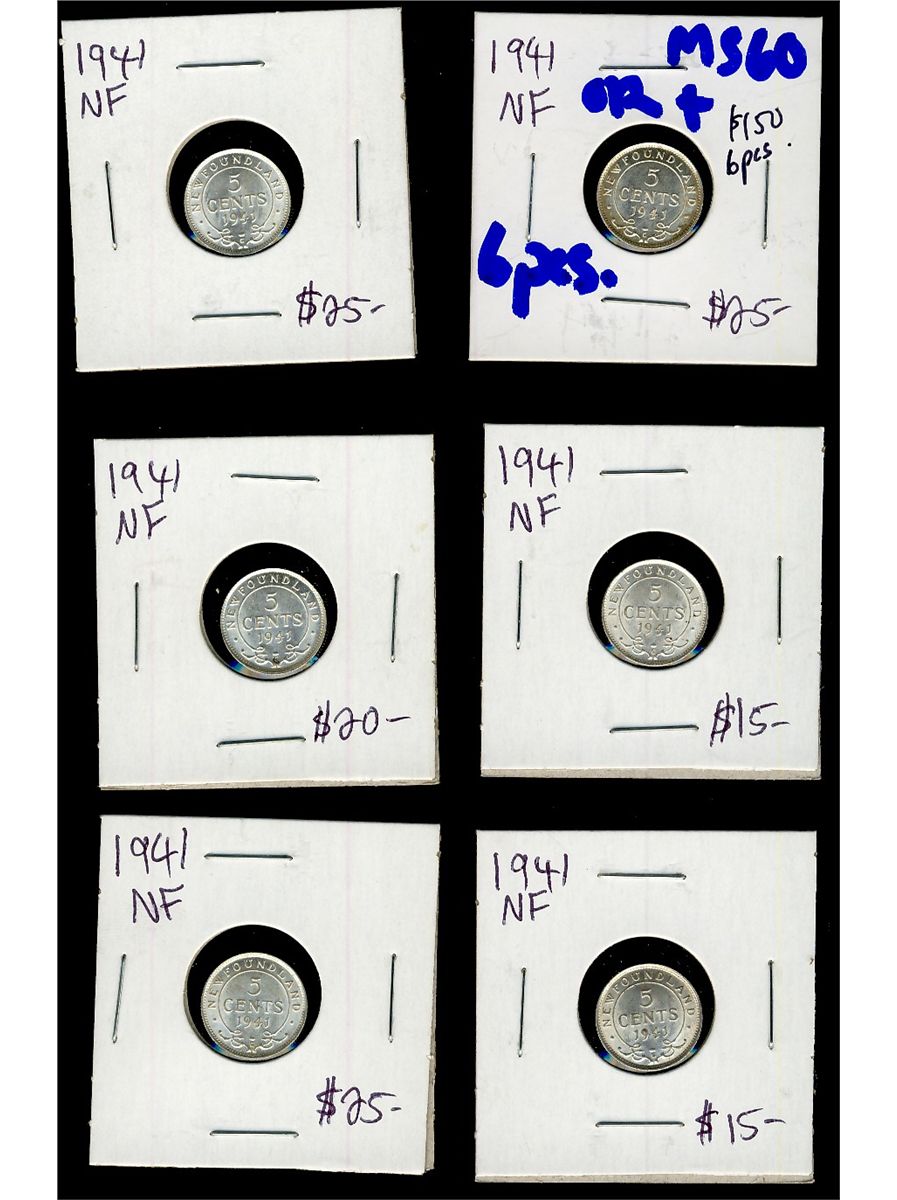 Nfld 1941c 5¢ Lot; includes 6 pcs MS60 or better. All white and lustrous.