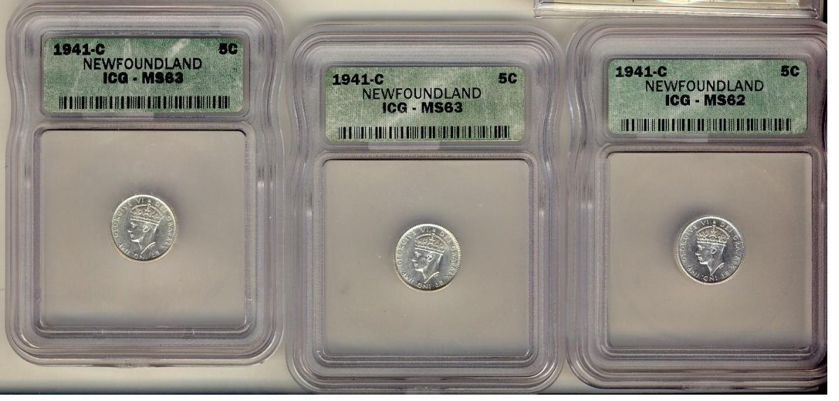 Nfld 1941c 5¢. Lot of 3 coins all ICCS graded. Includes MS62 & MS63(2).