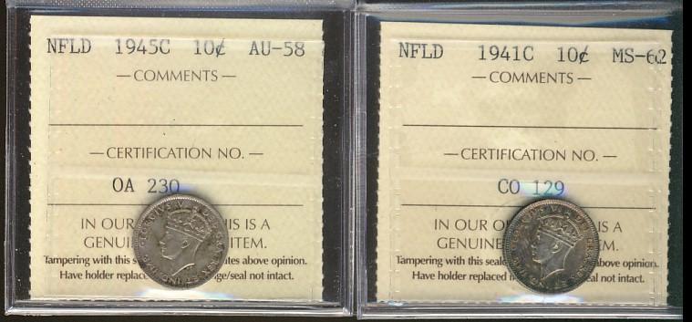 Nfld 1941c MS62 & 1945c AU58 10¢. Lot of 2 ICCS coins.