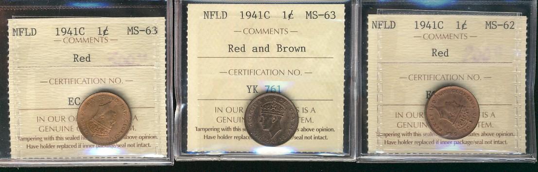 Nfld 1941c MS63RB(2) & MS62RD. Lot of 3 ICCS graded coins.