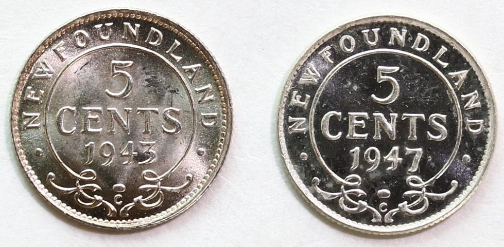 Nfld; 1943 5¢,1947c, Lot of 2 coins Unc or better.