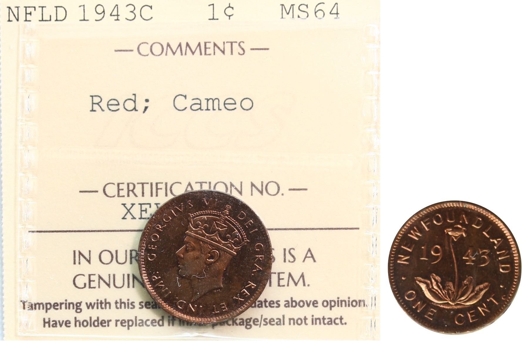 Nfld; 1943-C 1¢ ICCS Choice Mint State-64 Red Cameo