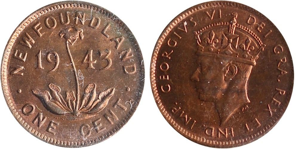 Nfld; 1943-C 1¢ ICCS Gem Mint State-65 Red, Amongst the best examples seen and handled by TCNC. Excessively scarce in this top condition. Worth a premium bid! A similar example brought in $2748 at The prominence XII Sale.