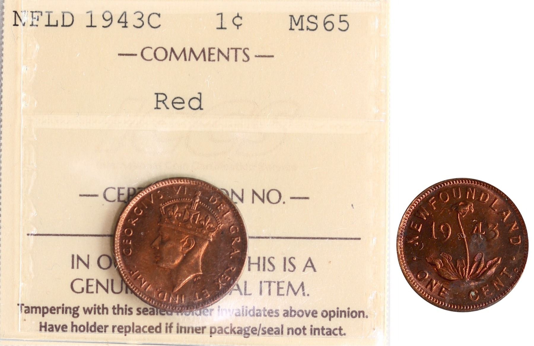 Nfld; 1943-C 1¢ ICCS Gem Mint State-65 Red, Amongst the best examples seen and handled by TCNC. Excessively scarce in this top condition. Worth a premium bid! A similar example brought in $2748 at The prominence XII Sale.