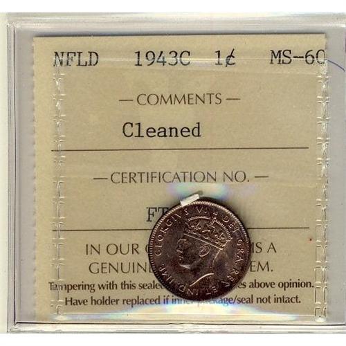 Nfld 1943c 1¢ ICCS MS60. Designated as clean.
