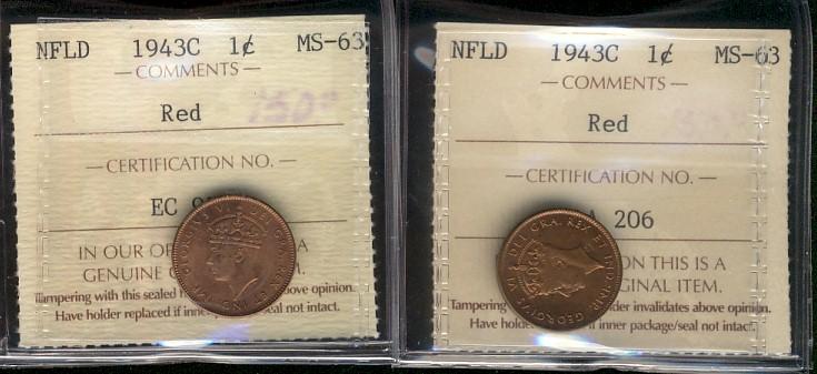Nfld 1943c 1¢ ICCS MS63RD. Lot of 2 coins.