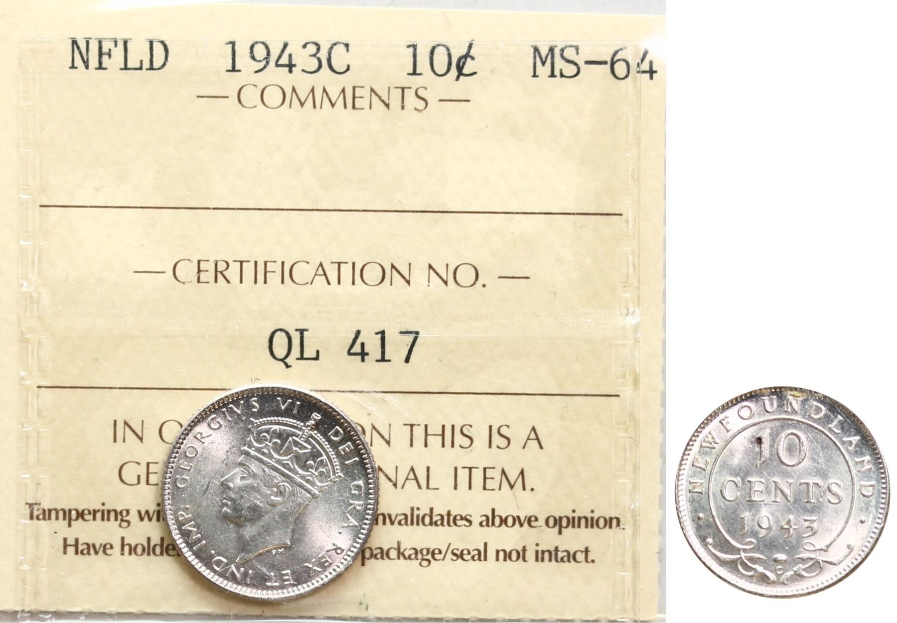 Nfld; 1943c 10¢ ICCS Very Choice Mint State-64 Brilliant and lustrous