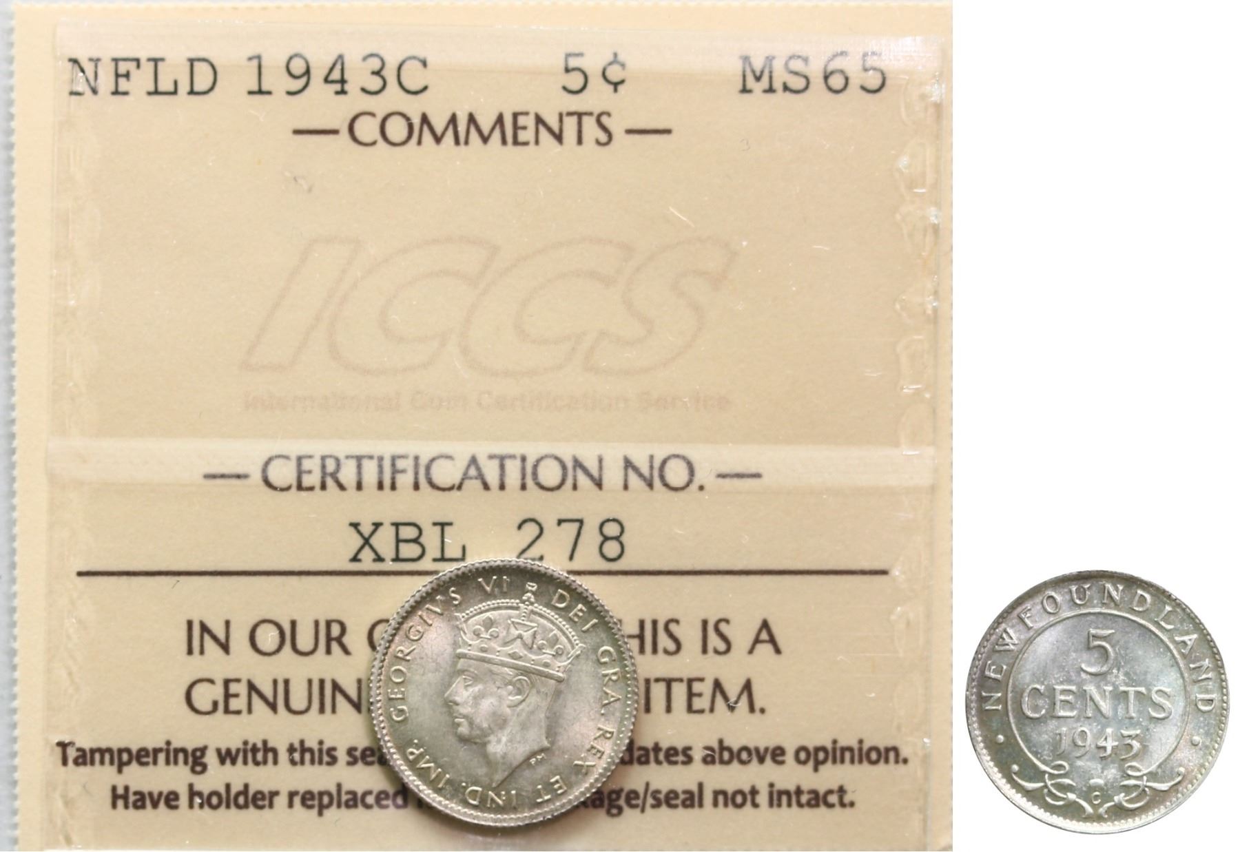 Nfld; 1943c 5¢ ICCS Gem Mint State-65 Brilliant and lustrous.