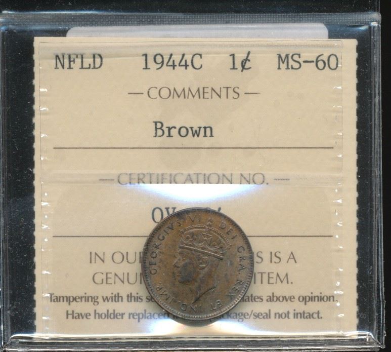 Nfld 1944 1¢ ICCS MS60 Brown. 30% Red. Key Date and nice.