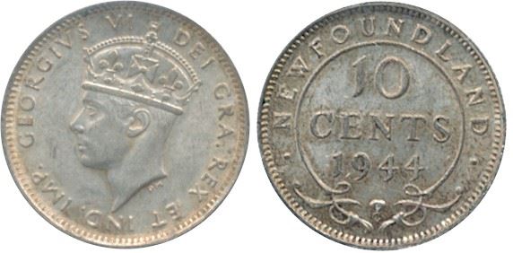 Nfld 1944c 10¢ ICCS MS64. Scarce date. Lustrous.