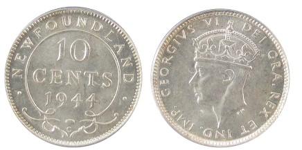 Nfld 1944c 10¢ PCGS MS63. Blast white. Rare date.