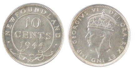 Nfld 1944c 10¢ PCGS MS63. Blast white. Rare date.