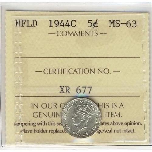 Nfld 1944c 5¢ ICCS MS63. Blast white.