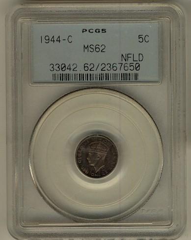 Nfld 1944c 5¢ PCGS MS62, toned.