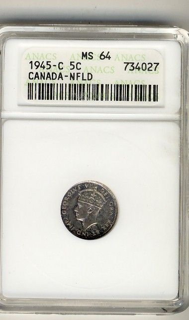 Nfld 1945c 5¢ ANACS MS64. Scattered tones over mirror fields.