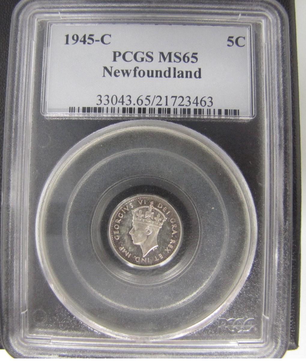 Nfld 1945c 5¢ PCGS MS65. Lustrous with light rim tones.