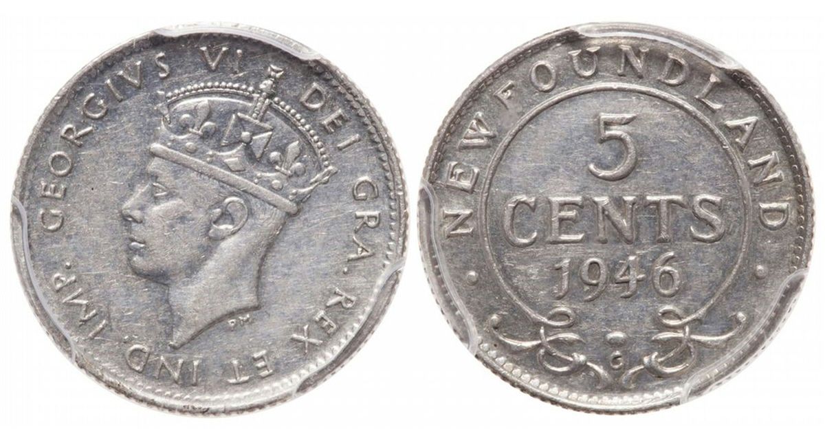 Nfld 1946c 5¢ PCGS AU55. Key issue with nice lustre.