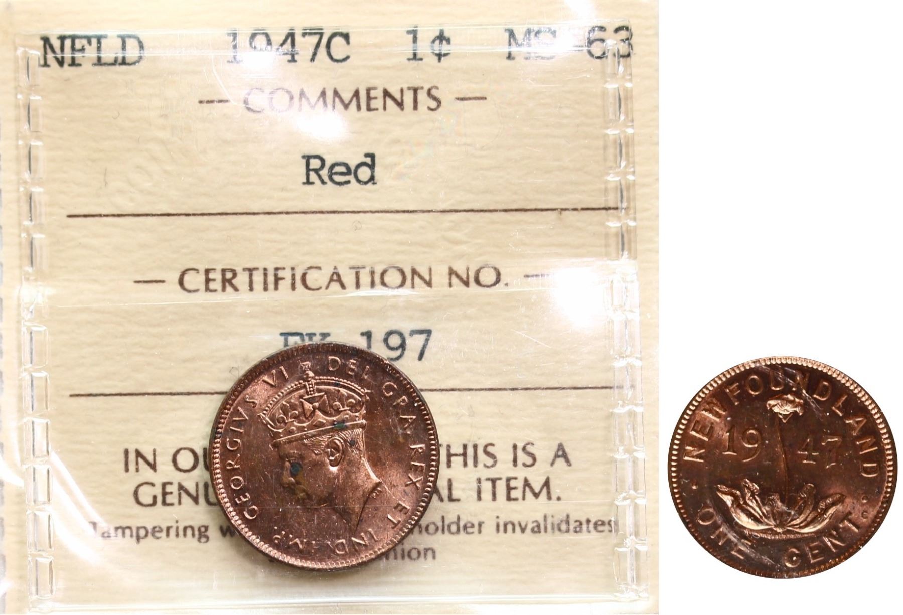 Nfld; 1947c 1¢ ICCS Choice Mint State-63 Red, 95% Red lustre.