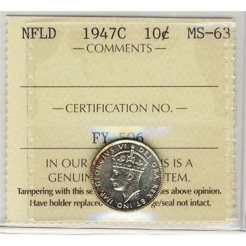 Nfld 1947c 10¢ ICCS MS63. Very attractive with full lustre.