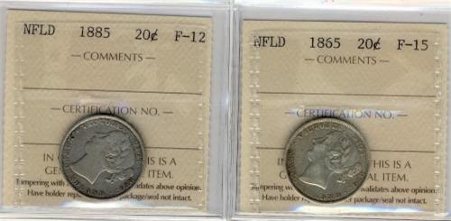Nfld 20¢ 1865 ICCS F15 and 1885 ICCS F12