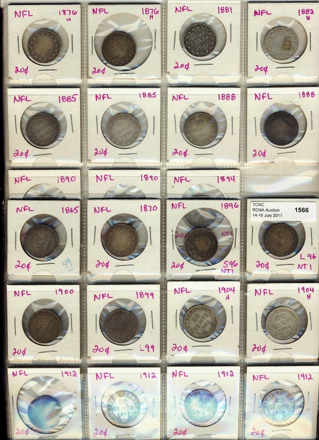 Nfld 20¢ & 25¢ Virtually complete date set, lot of 31 pieces. 1865, 1870, 1872H, 1873, 1876H (3), 1880, 1881, 1882H, 1885 (2), 1888 (2), 1890 (2), 1894, 1896 (4), 1899, 1900, 1904H (2), 1912 (4), 1917c, 1919c. Grades vary from AG-2 to F-15.