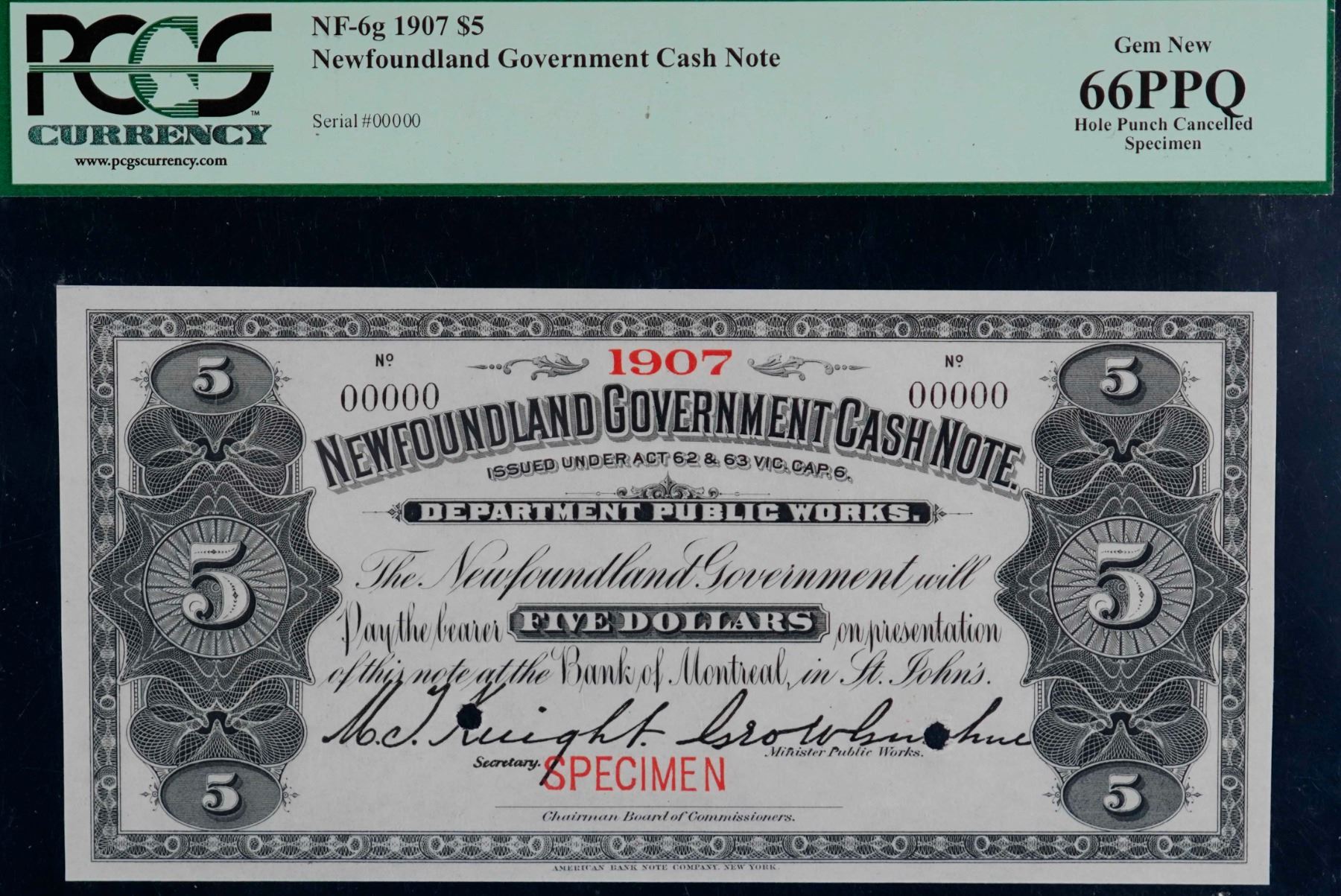 Nfld Cash Note; 1907 $5 NF-6g, PCGS Superb Gem Uncirculated-66PPQ.