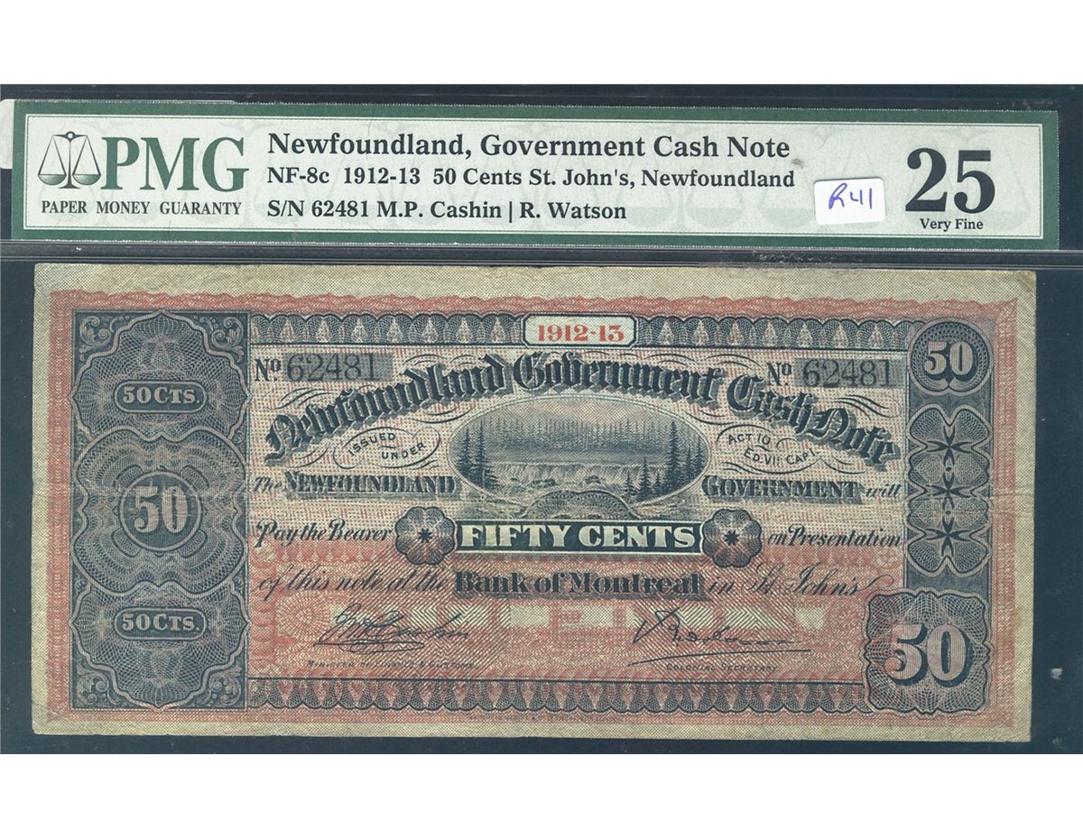 Nfld Cash Note; 1912-13 50¢ NF-8c #62481 PMG VF25.