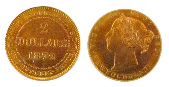 Nfld Gold 1872 $2 PCGS MS64. Excellent strike with clean fields and great surfaces. The nicest example ever handled by TCNC. Gem lustre. Very rare.