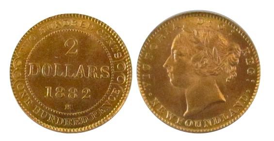 Nfld Gold 1882H $2 PCGS MS63. Super lustre and great fields.