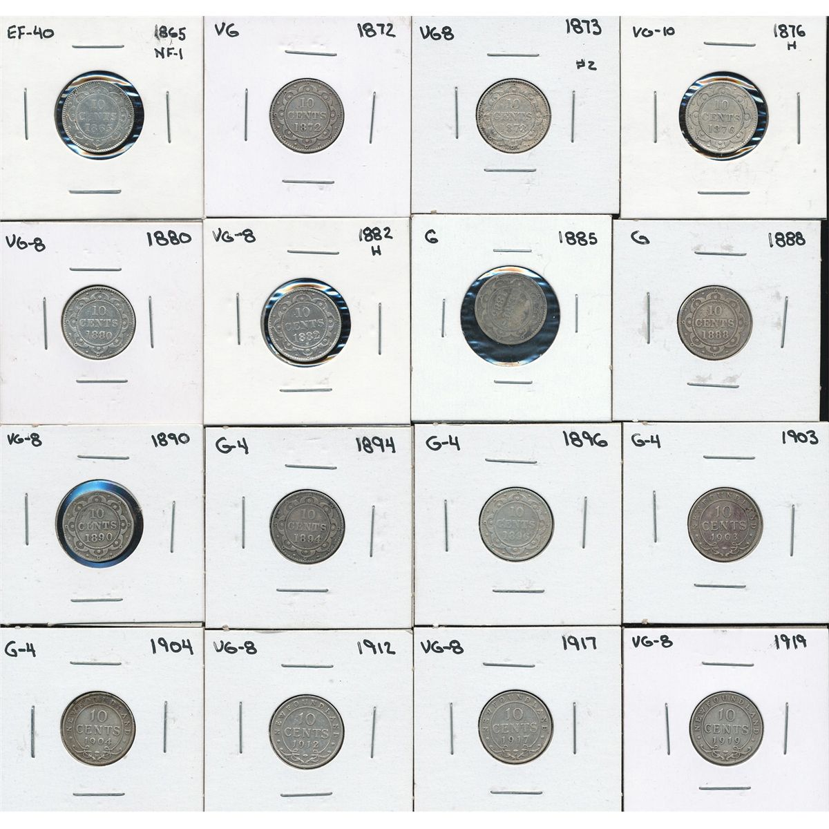 Nfld Lot; includes 10¢ incomplete date set. 1865 (VF30), 1872, 1873, 1876H, 1880, 1882H, 1885 & 1888 to 1947c excluding re-engraved issues. A nice lot of 25 coins with very few problem coins Good to VF.