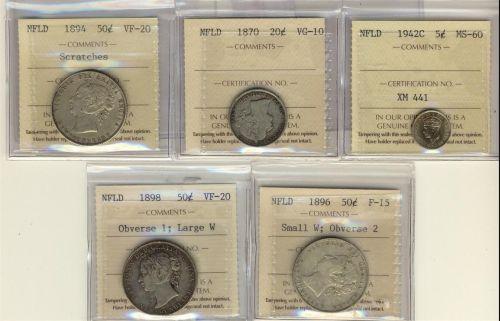 Nfld, Lot of 5 Newfoundland coins all ICCS graded, includes 1942c 5¢ MS60, 1870 20¢ VG10, 1894 50¢ V